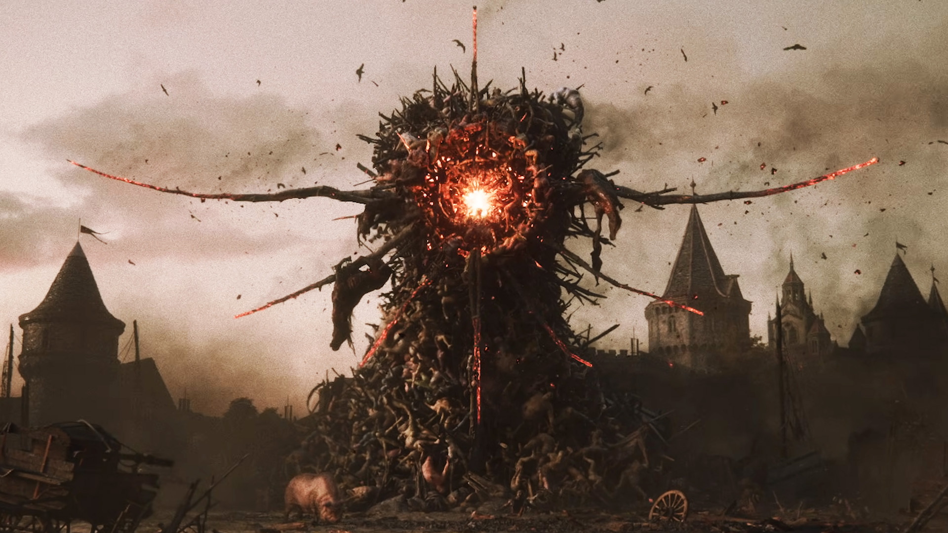 The happy scene is soon revealed to be a ritualistic celebration, where a man wrapped in chains and strapped to a post is being sacrificed in a Wicker Man-style totem. Around him, people in masks whip themselves, and the crowd claps in joy as the man is set ablaze to the backdrop of a rip in the sky and what looks like an eclipse as darkness settles in.