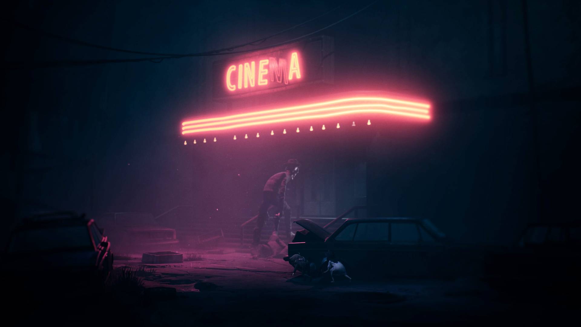 The first level starts in the sewers, detouring through a train graveyard, a forest of skin-trees (skins hanging from branches, I don’t know how else to describe it), and finally into a city where the first building we encounter is a cinema. It’s a lot, and though Reanimal is undeniably gorgeous and does a great job of showcasing its beauty from the get-go, I’m already at odds around what this area is, or what it’s meant to represent, and how this level’s Big Bad fits into it. He doesn’t seem to have any real theme, apart from portalling through the stomachs of dead bodies and putting some clothes in the washing machine.